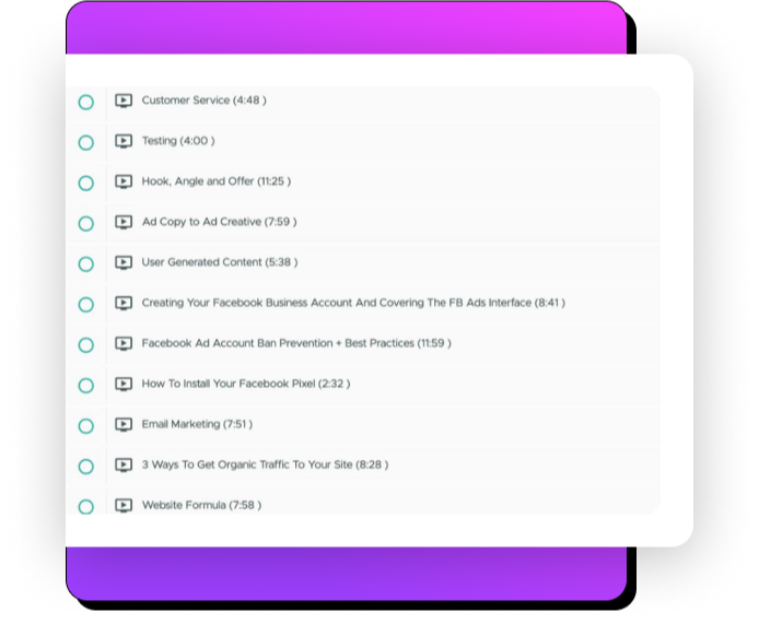 Once your store is built, you will receive an invite link to watch and learn from 35 Shopify tutorial videos. In these videos, you will learn all my exact strategies and ecom theory. By the end, you will have a well rounded understanding of how to run a successful store.